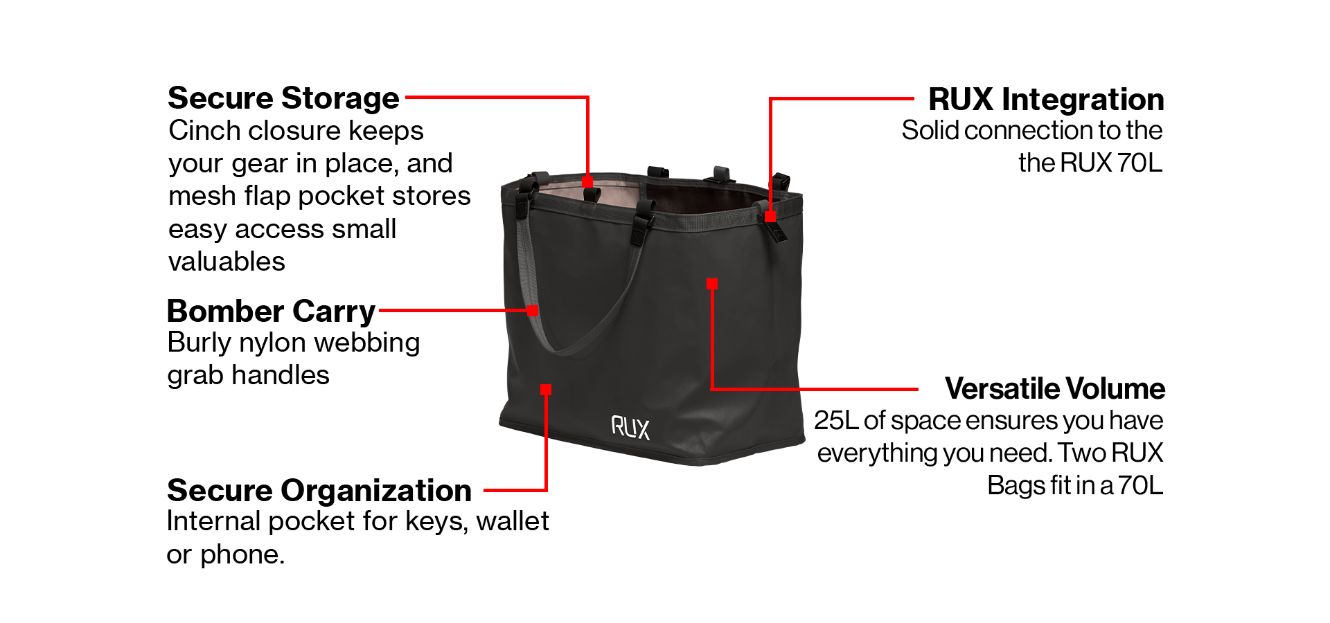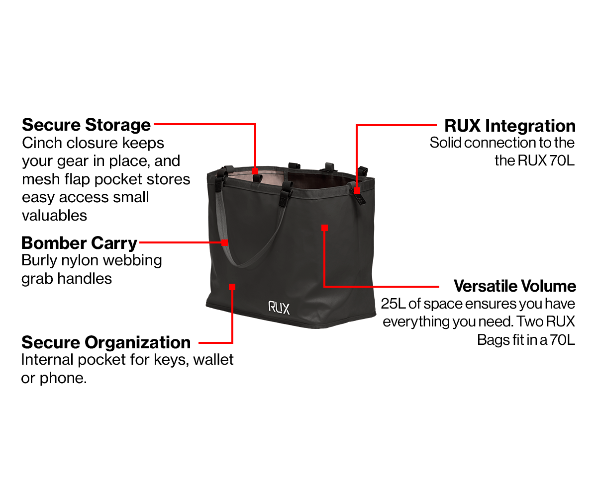 Le RUX Bag s'intègre parfaitement au RUX 70L, en se verrouillant dans le système Utility Rail avec nos boucles RUX. Gardez votre équipement séparé et organisé !