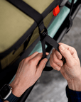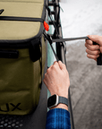 Les sangles d'arrimage RUX se clipsent facilement dans le rail utilitaire du RUX 70L, permettant une connexion rapide, sans stress et sécurisée.
