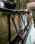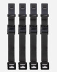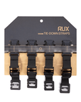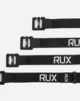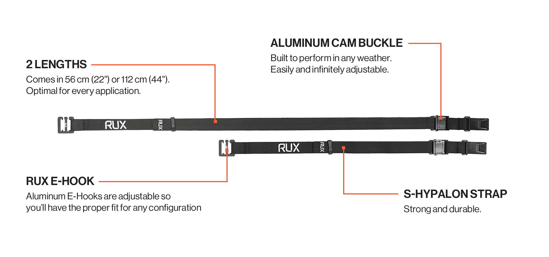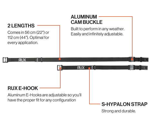 The straps have a E-Hook at one end and a RUX buckle at the other end. On the E-Hook end, you can easily loop the strap around a rack rail then secure it back onto itself. At the other end, the RUX Buckle securely connects to the Utility Rails on your RUX 70L.