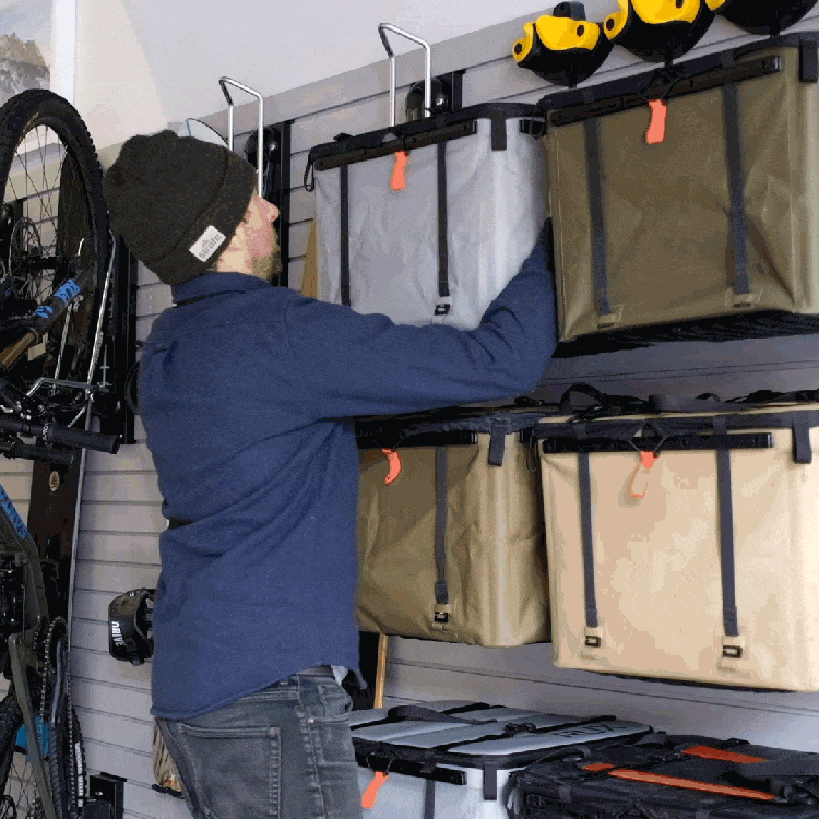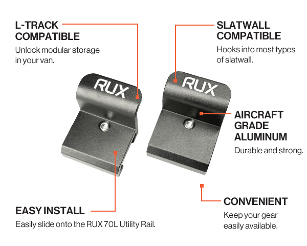 Rendez votre RUX 70L compatible avec les panneaux rainurés ou les rails en L ! Profitez d'un stockage modulaire rapide pour votre maison, votre garage, votre camionnette, votre camion, votre atelier ou tout autre endroit où vous avez installé des panneaux rainurés ou des rails en L.